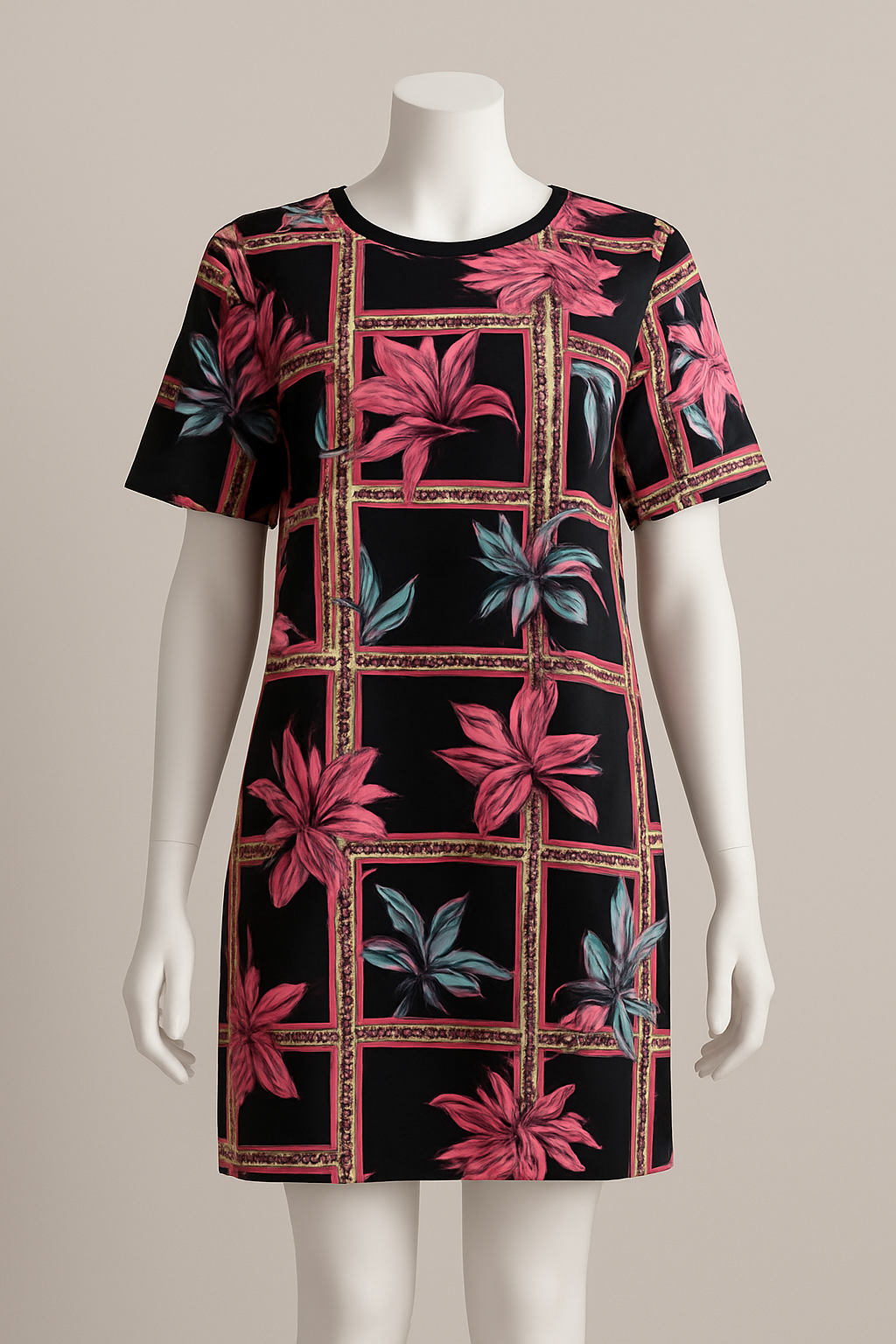 O vestido camisão floral preto com detalhes em rosa e verde é a peça perfeita para unir conforto, estilo e sofisticação.