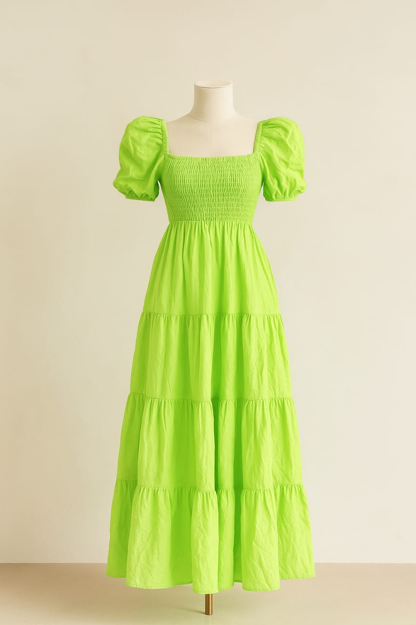 O vestido midi verde neon é a escolha ideal para quem deseja unir elegância e conforto. Com mangas bufantes modernas, busto com elastano e caimento fluido, este modelo valoriza a silhueta e proporciona leveza em qualquer ocasião.